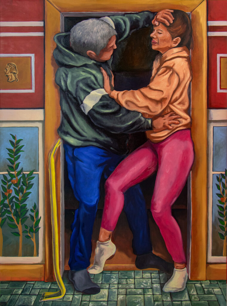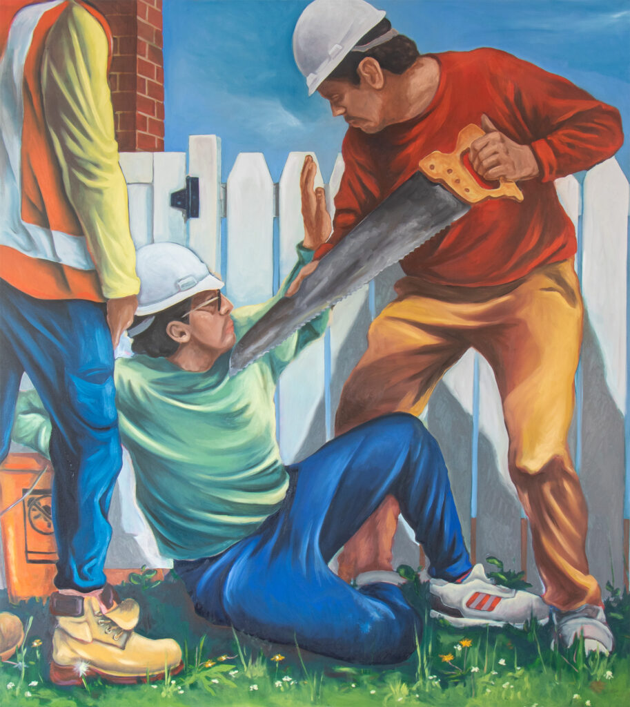 Drawing from the Abduction of the Sabine Women, The Labors of a Sabine collapses antiquity into the present to consider how nations are formed through coercion and how labor exploitation is often gendered. During my time working with the New Jersey Monuments to Migration and Labor (NJ MML), a series of community dialogues revealed recurring accounts of physical and sexual exploitation experienced by temporary workers, many of them undocumented women. These testimonies inform the painting’s parable-like structure, connecting an ancient founding myth to contemporary systems in which vulnerable laborers are incorporated into economic life under conditions of imbalance and coercion.