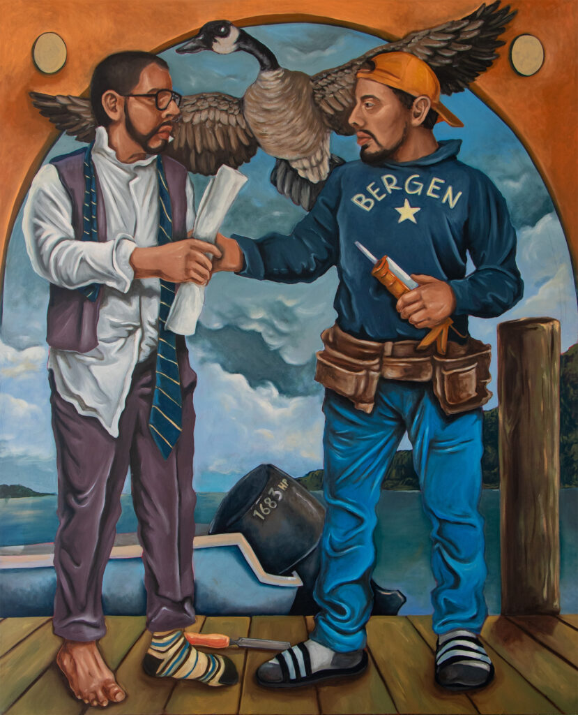 Referencing Kahlo’s use of mirrored figures in Las Dos Fridas as carriers of shared identity rather than opposition, Los Dos Bergens positions Bergen County as a site shaped by ongoing movement from the Global South and by a deep history of labor activism.