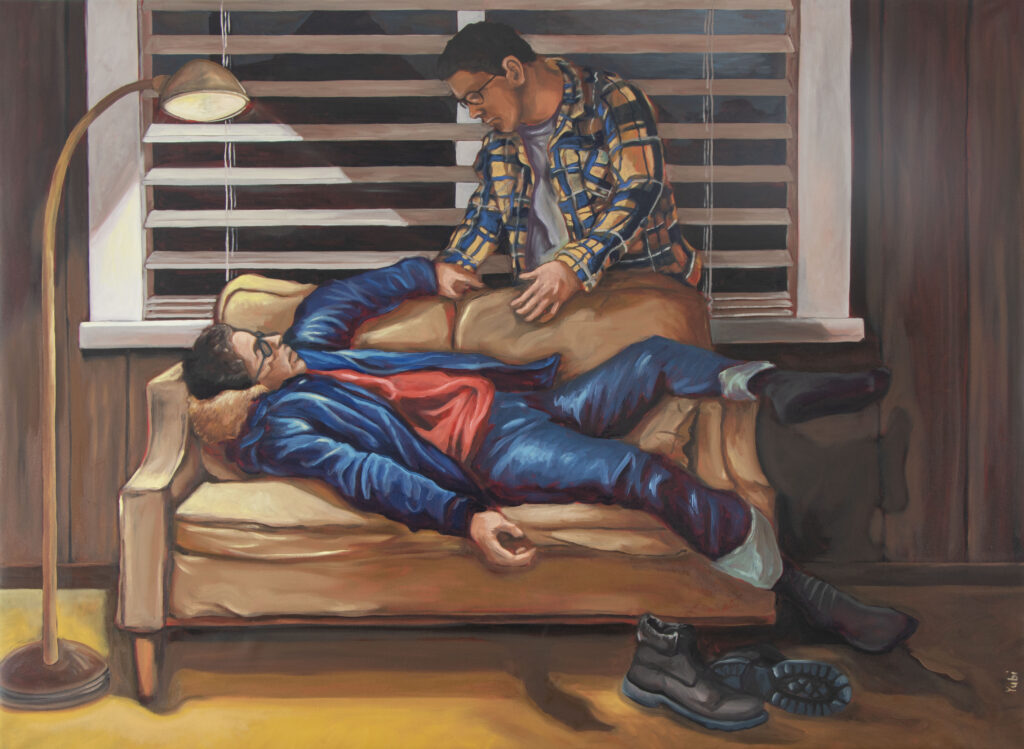 The Annunciation reconfigures the biblical scene through self-portraiture, occupying the roles of both the Virgin Mary and the angel, and transforming revelation into an internal reckoning rather than a divine interruption. The reclining body appears exhausted and disheveled, boots scattered on the floor, while the standing figure leans in with measured gravity.