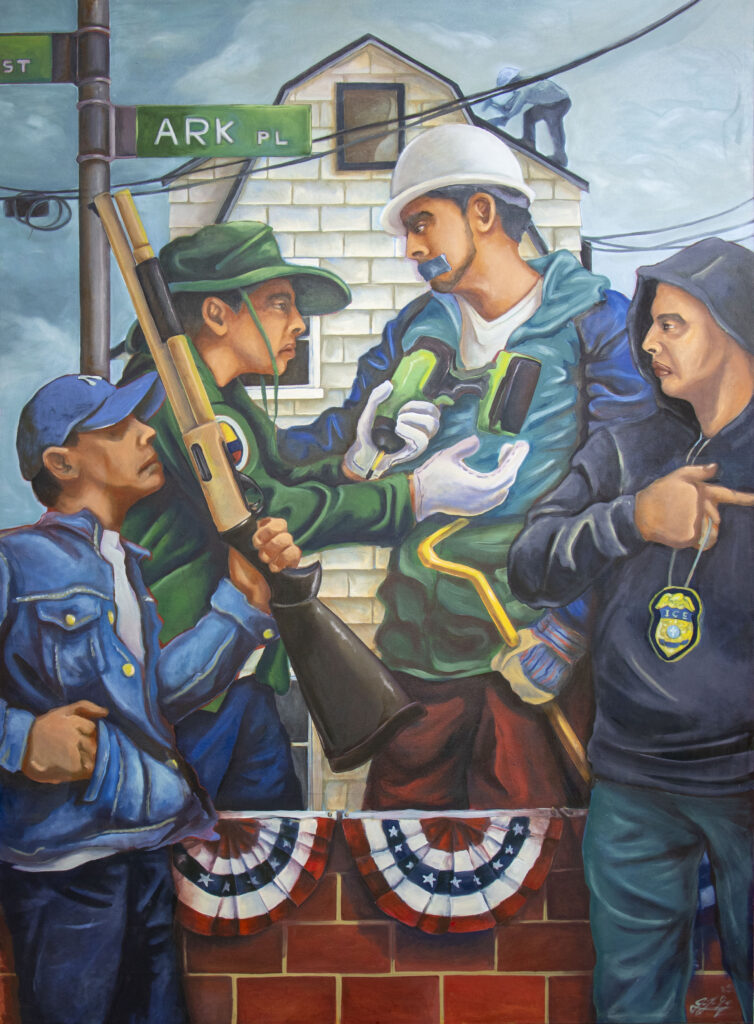 La Marcha de Octubre reimagines the Women’s March on Versailles (1789) within a modern warehouse, centering the strength of immigrant women laborers. A group of workers gathers in solidarity, their orange shirts evoking both visibility and unity. The central figure holds a document marked PL 2023 Chapter 10, referencing New Jersey’s law protecting temporary workers’ rights. Name tags link three women to historic Latina labor activists, bridging past and present struggles. Surrounding shelves bear corporate packages, a reminder of the industries dependent on precarious labor. With brooms and mops raised as symbols of resistance, the women stand poised for collective action.